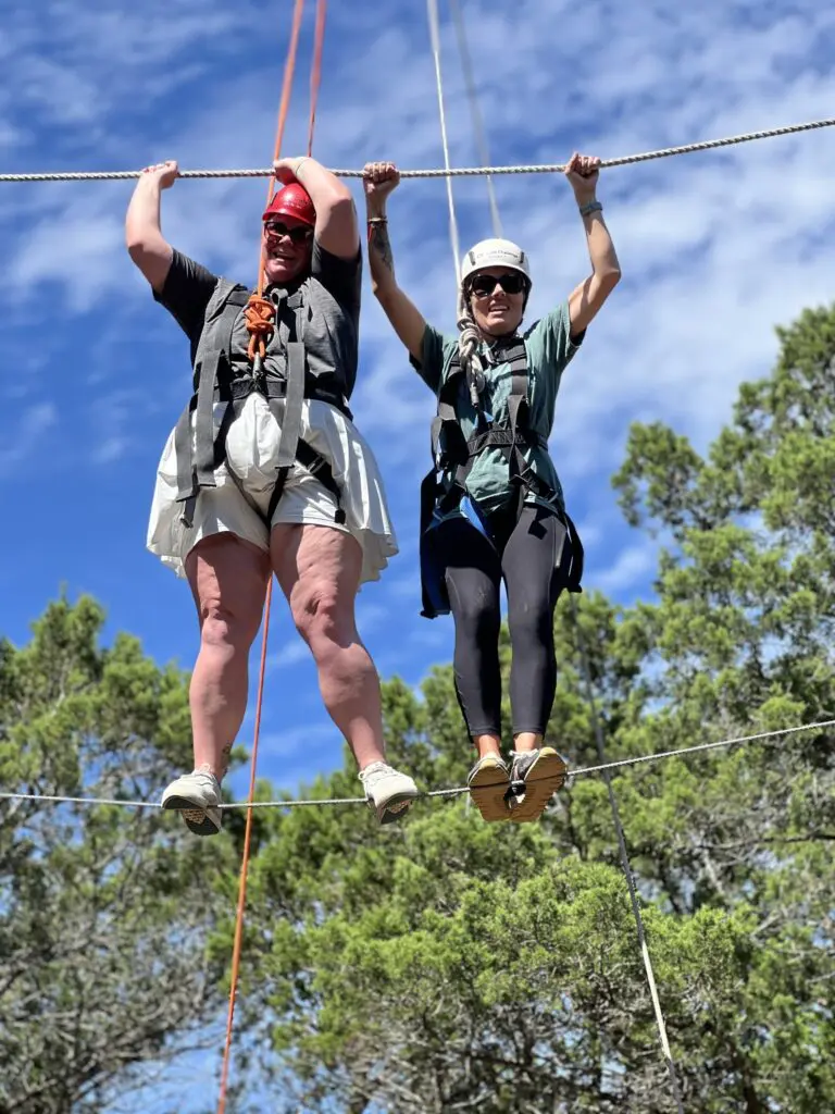 Corporate team celebrating after completing high ropes challenge in San Antonio.